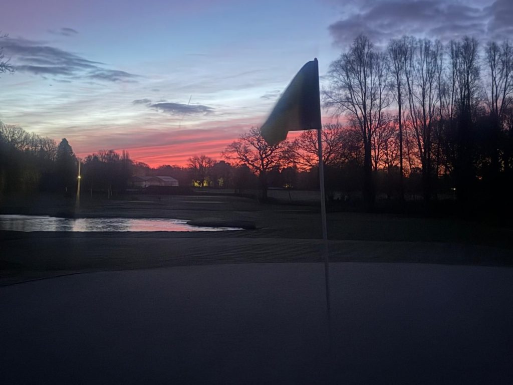The course getting a frosty set up with holes trimm and bunkers raked.