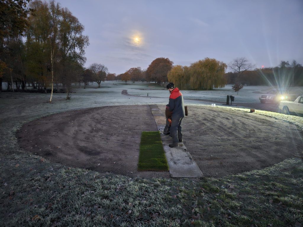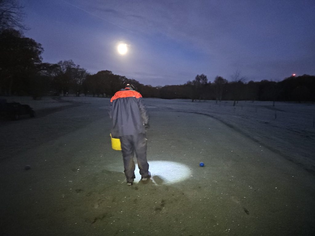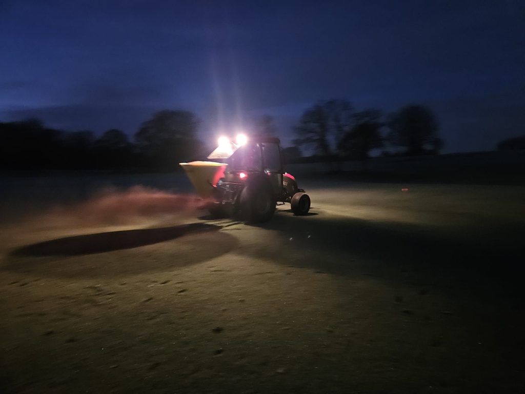 Granular fertiliser applied to certain area’s before the rain later this eve. This will leave some bruised marks on the Turf, but the rewards outweighs the marks.