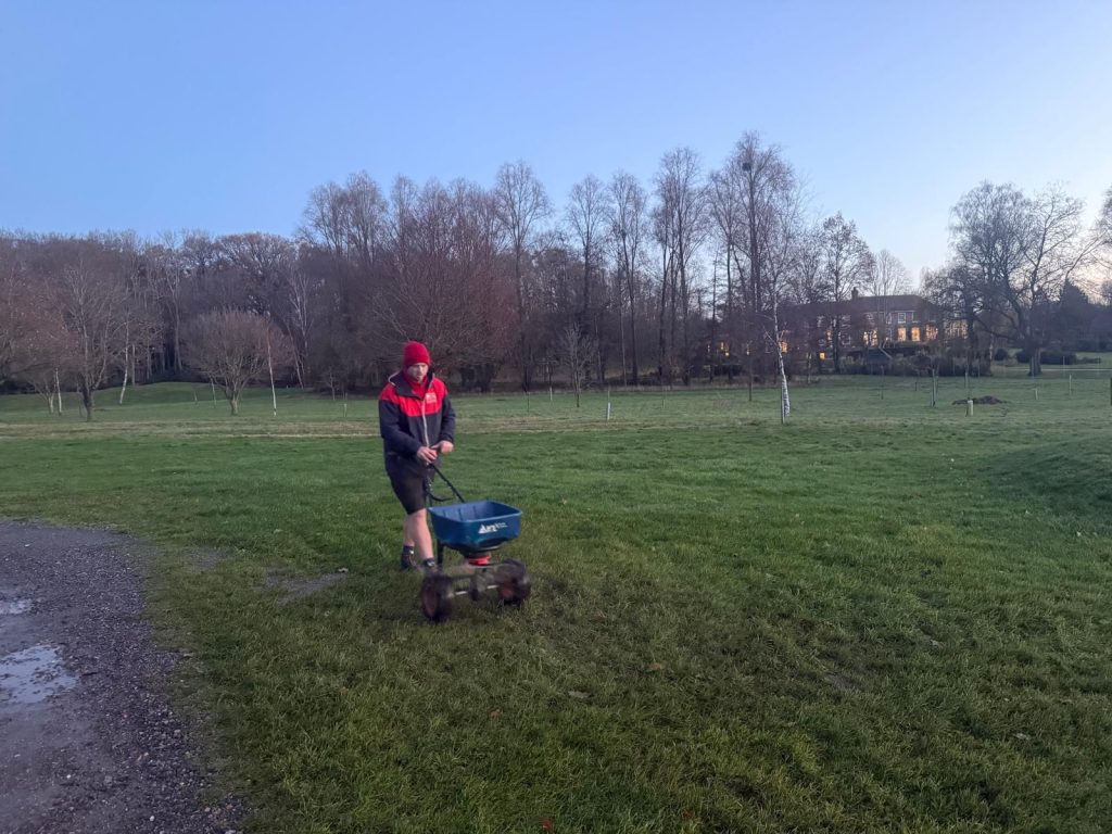 Granular fertiliser applied to certain area's before the rain later this eve. This will leave some bruised marks on the Turf, but the rewards outweighs the marks.