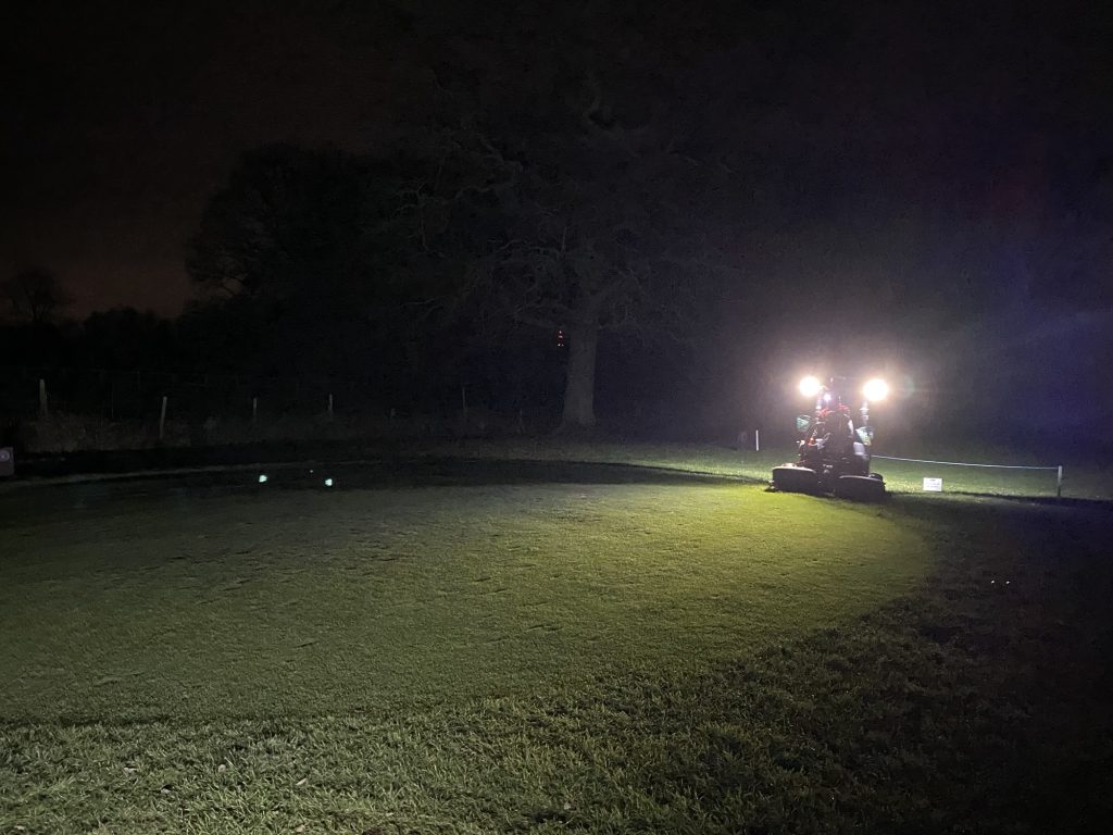 An overdue spray on the Greens. Some Acid, Mg, Mn, Zn, Cu, Ca, N, PGR & some Penetrant Wetter. This will leave some undulations and wheel marks but the Grass doesn't care about the conditions, needs must.